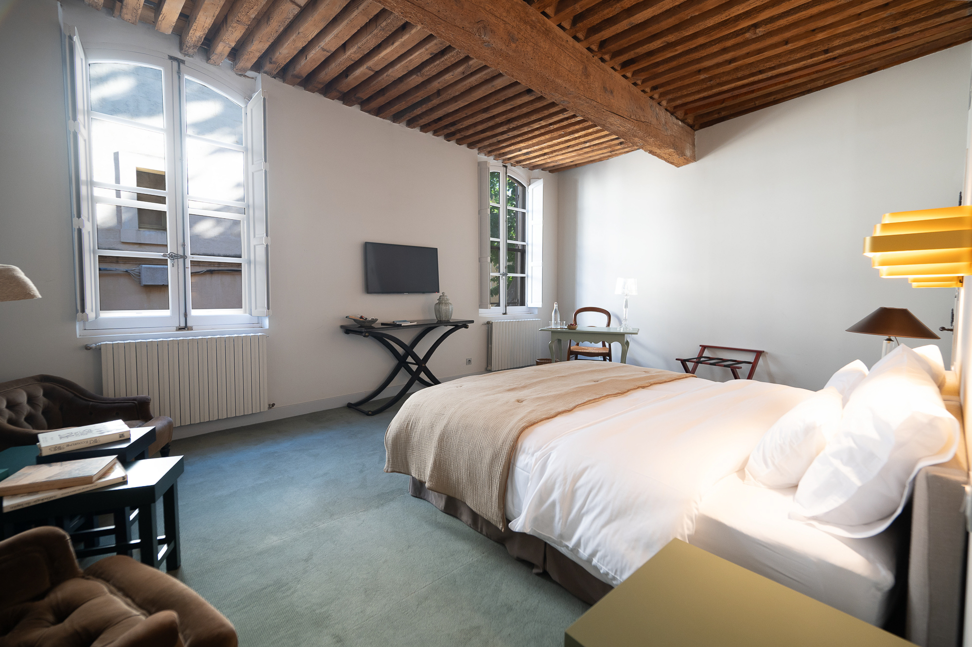 25m2Lit King Size 180×200 avec surmatelasSalle de bain avec douche, grande vasque et penderieClimatisation, TV, wifi, moustiquaireTarif direct : 220€ TTC petit déjeuner compris